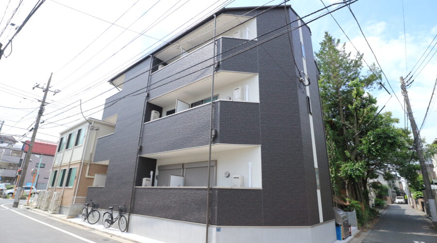 板橋区のワンルーム条例で、10戸以上の建物は1mの自主管理道路が必要になってしまうため、無理に狭小の企画で戸数を稼ぐことは避け、9戸で角地の敷地を最大限活かした無理のない企画に仕上げました。